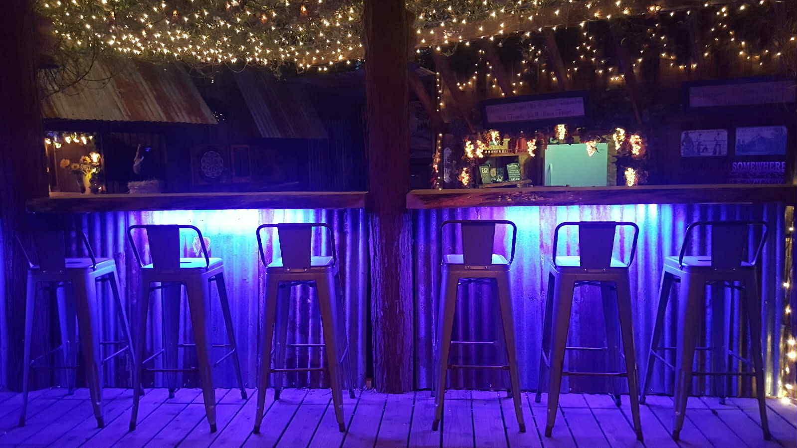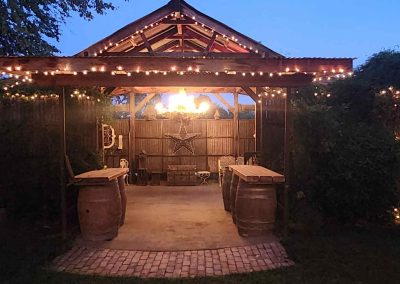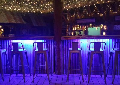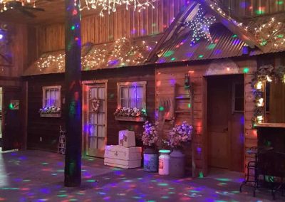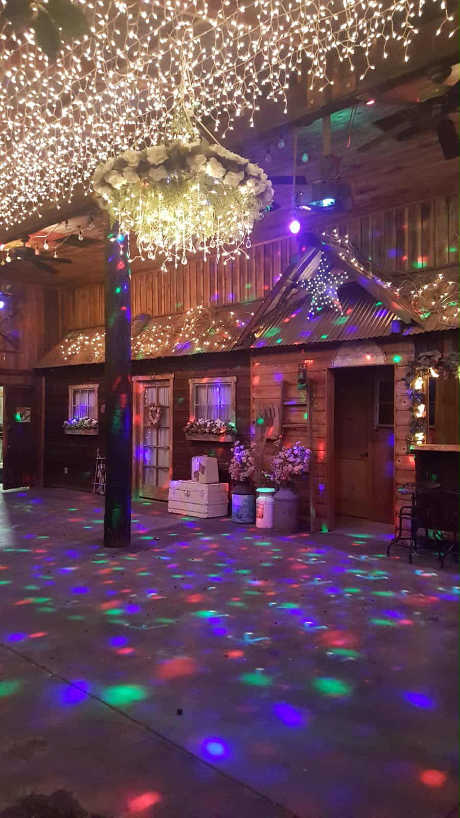 Our signature twinkle lights along with multiple chandeleirs create a warm, romantic ambience throughout the venue. The large dance floor invites celebration while a whimsical cake gazebo adds a unique touch to your reception.