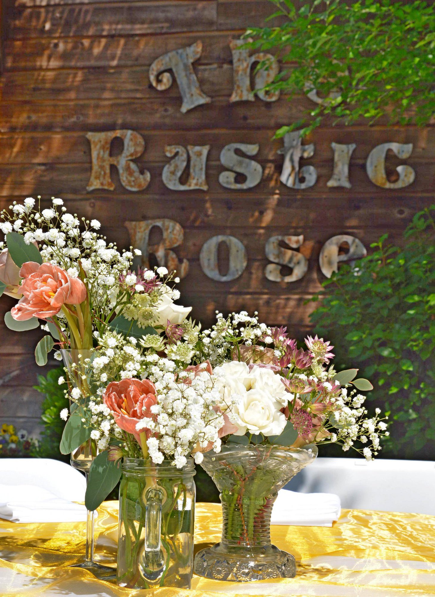 - Use of inventory including- wood rounds, vases, lanterns, shepherd’s hooks, Faux florals, greenery and signage