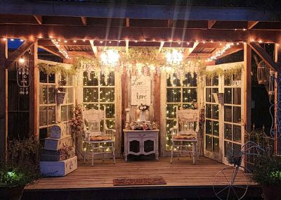 - Use of inventory- including wood rounds, vases, lanterns, shepherd’s hooks, Faux florals, greenery and signage.
